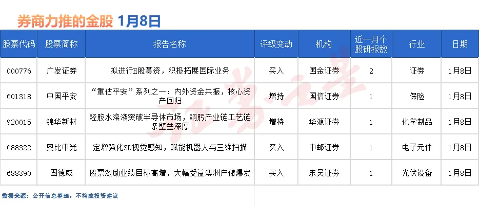 广发证券最受券商关注,近一个月获东吴证券等2份券商研报关注,位居1月8日券商力推股榜首。
