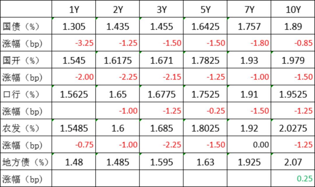 截止17:15,利率债二级市场中,利率成交价格总体呈下跌趋势,其中下跌程度较大的有2年期国开债,收益率下跌2.25bp,报1.6175%;1年期国债,收益率下跌3.25bp,报1.305%;3年期农发债,收益率下跌2.25bp,报1.685%,3年期国开债,收益率下跌2.15bp,报1.671%。