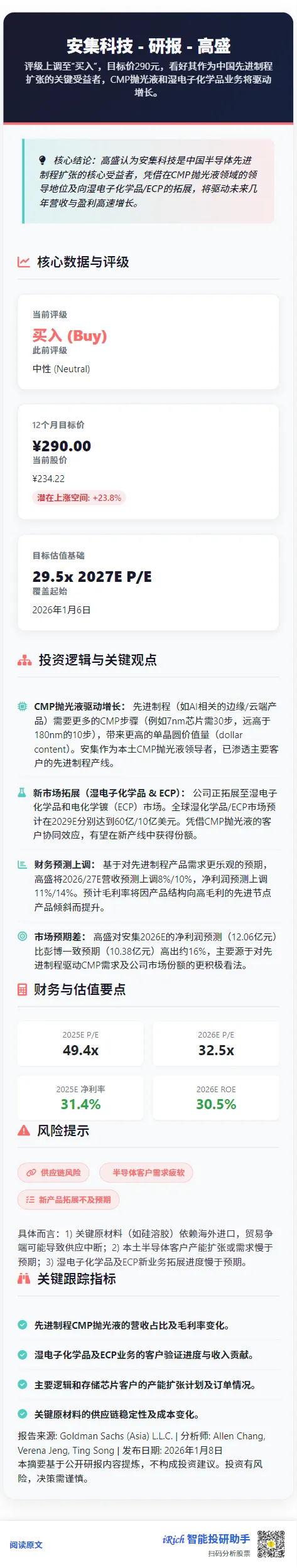 高盛发布研究报告,将安集微电子(688019.SS)评级从“中性”上调至“买入”,12个月目标价设定为290元人民币,较当前价格234.22元存在23.8%上行空间。报告核心论调基于安集微电子作为中国先进制程扩张的关键受益者,其CMP浆料和湿化学品业务将驱动未来增长。作为买方分析师,本文从投资逻辑角度深度解析高盛报告,聚焦行业趋势、财务预测与风险收益比。