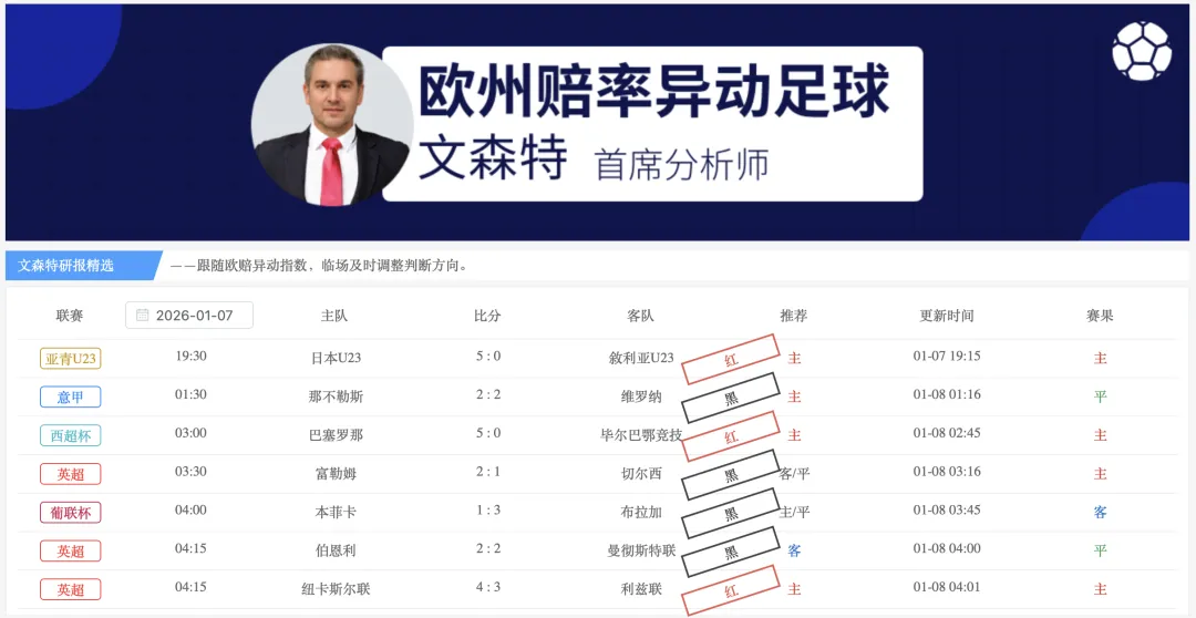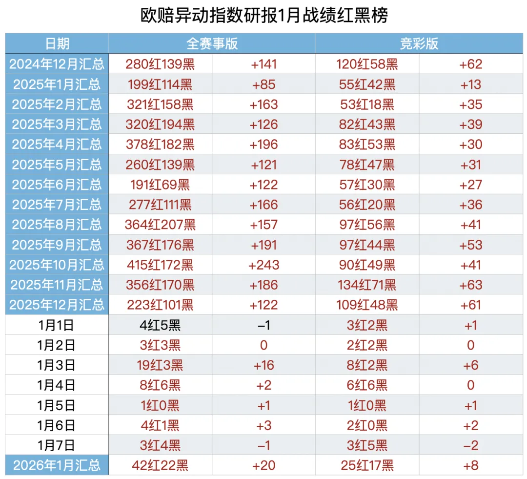 【欧指异动指数】(全赛事版)栏目的研报给出7场比赛,3红4黑,1月累计42红22黑,净胜20,观察20家主力公司的临场指数变化,掌控比赛方向,1月稳定性达到65.6%。