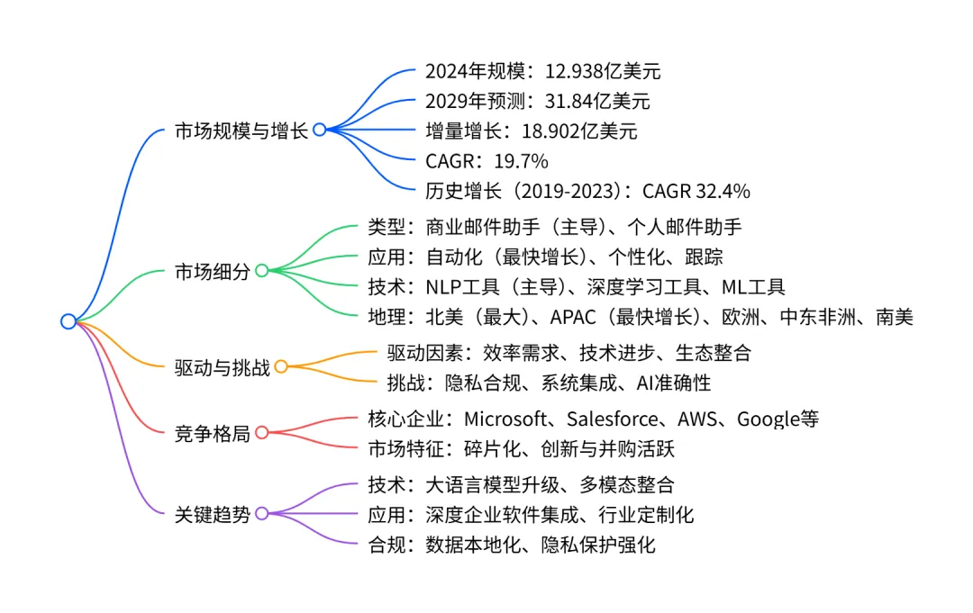 2024-2029 年全球 AI 邮件助手市场呈现加速增长态势,2024 年市场规模达 12.938 亿美元,预计 2029 年将增至 31.84 亿美元,CAGR 为 19.7%,增量增长 18.902 亿美元;市场以北美为最大区域市场(2024 年占比 37.6%)、商业邮件助手为最大类型细分(2024 年占比 68.5%)、自动化为最快增长应用领域(CAGR 21.0%)、NLP 工具为核心技术支撑(2024 年占比 48.2%);驱动因素包括办公效率提升需求、NLP 与生成式 AI 技术进步及企业软件生态整合,同时面临数据隐私合规、系统集成复杂及 AI 准确性等挑战,市场竞争呈现科技巨头与专业初创企业共存的格局。
