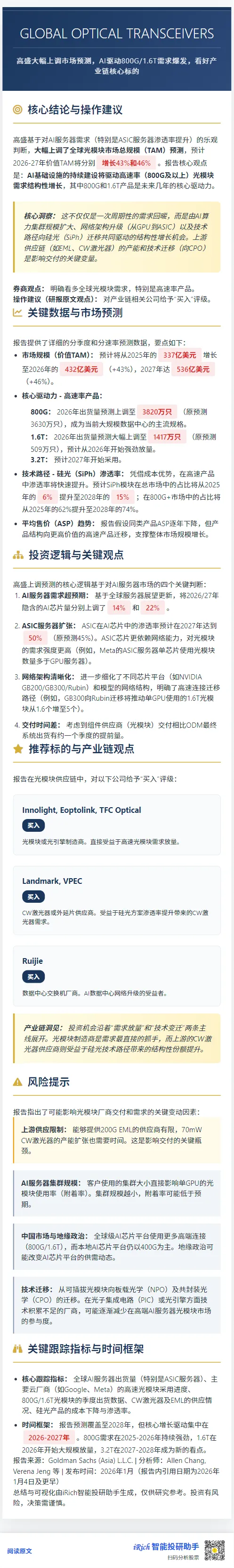 在全球人工智能基础设施加速部署的背景下,光收发器作为数据中心网络的核心组件,正迎来历史性增长机遇。高盛最新研究报告(2026年1月8日发布)对全球光收发器市场总规模(TAM)进行了大幅上调,预测2026-2027年价值TAM将提升43%和46%,其中800G和1.6T产品成为核心驱动力。本文基于高盛报告的深度解析,从市场预测、技术迁移、供应链格局及风险因素等多维度展开结构化分析,为投资者提供客观、前瞻的洞察。