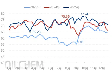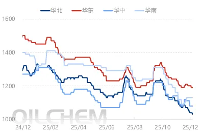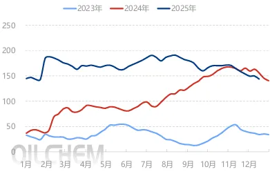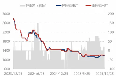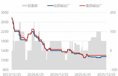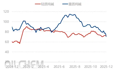 截至2025年12月底,国内纯碱厂家总库存143.85万吨,较前期下降6.08万吨,跌幅4.06%。其中,轻质纯碱73.55万吨,环比增加0.79万吨;重质纯碱70.30万吨,环比减少6.87万吨。去年同期库存量为145.49万吨,同比下降1.64万吨,跌幅1.13%。