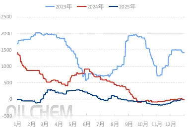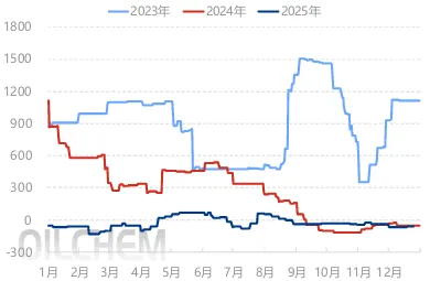 2023-2025年氨碱法纯碱利润走势图(元/吨)