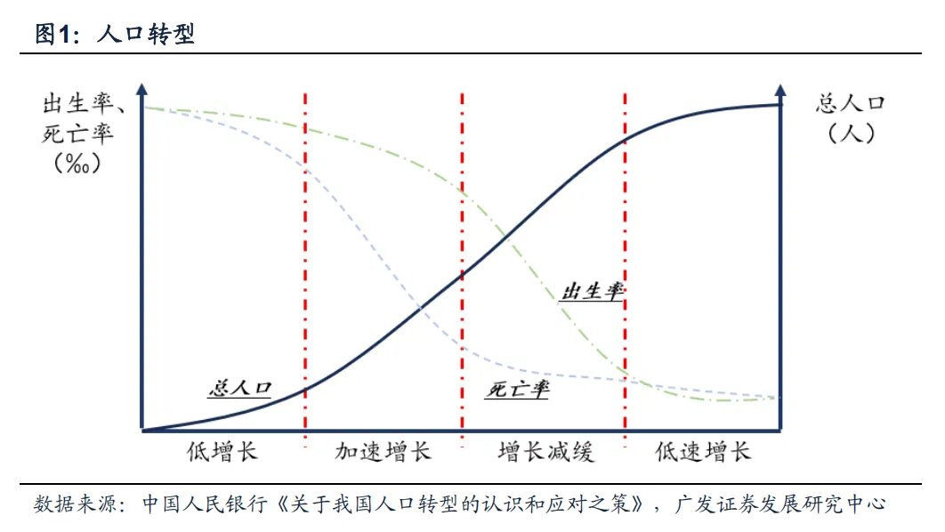 从最宏观/底层逻辑上看,人口周期决定了经济增长周期与银行的经营周期。按照央行论文《关于我国人口转型的认识和应对之策》来看,人口转型存在四个阶段,分别是“低增长-加速增长-增长减缓-低增长”,其对应着一个国家从工业化前的经济体制向工业化经济体制过渡,伴随着从高出生率/死亡率到低出生率/死亡率,四个阶段基本对应“工业革命前的农业社会-工业化初中期阶段-工业化的中后期阶段-完成工业化的国家”四个阶段。对于发展中国家,由于工业化、城市化进程较晚,其死亡率较出生率的波动滞后性更为明显,即人口的周期性更明显。