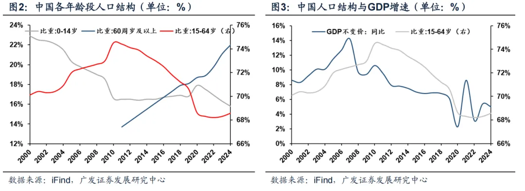 ①从经济增长来看,劳动力人口的下降使得经济潜在增长率下降。传统经济模型更重视资本积累和科技进步、强调边际收益递减,忽略人口对于经济增长的重要性,从数据上看,国内15-64岁人口数占比自2010年后开始下降,2020年以来低于70%;