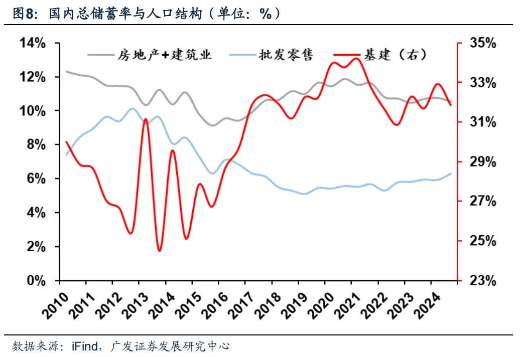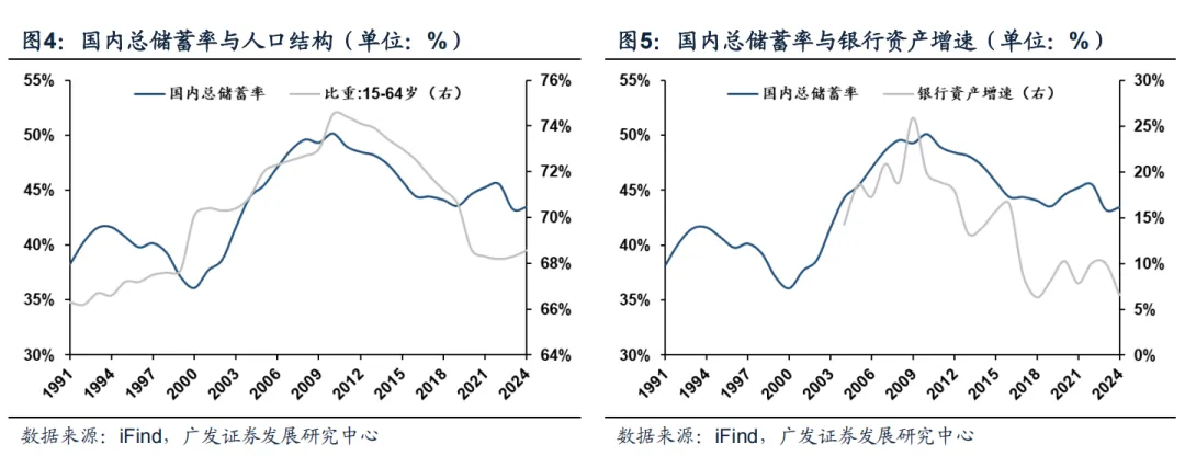 ②从储蓄供给上看,储蓄规模下降是2010年以来的新特征。根据弗兰克-莫迪利安的《生命周期假说》,财富盈余期是在25-60岁,即收入大于支出,个人基于平滑未来消费的考虑会增加储蓄,而伴随人口老龄化,储蓄会逐步用于养老消费而非生产性投资,即对后续的资本性投资承压。数据上看,国内总储蓄率在2010年达到峰值为50.1%。