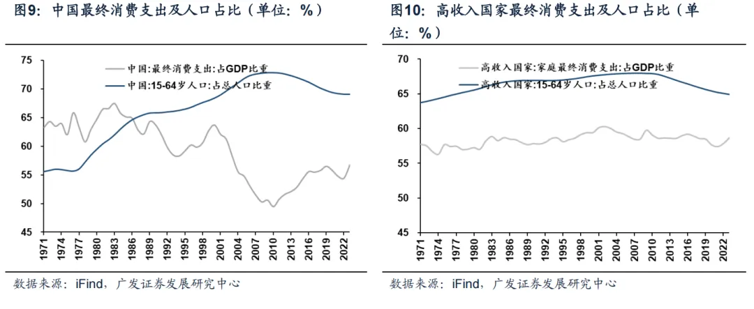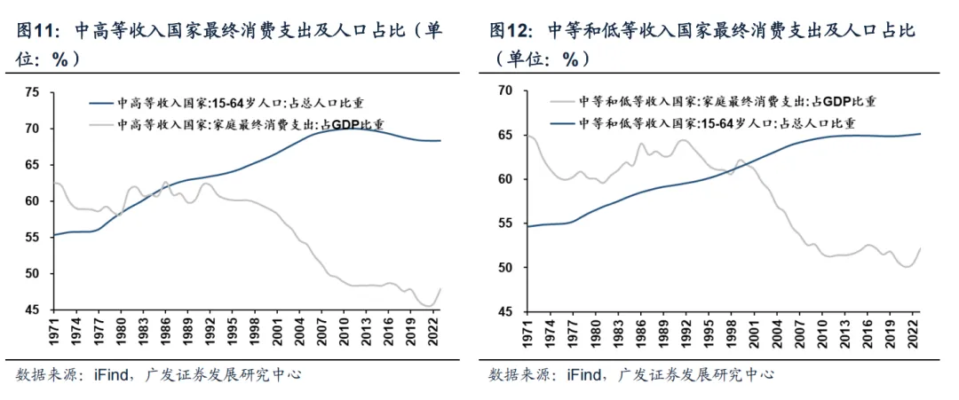 当下提出消费及内循环,有其现实意义。一是从前文可以判断,劳动力人口占比下滑使得储蓄率降低,使得劳动密集型产业、出口和以投资为主导产业结构亟待转型,方向上会更依赖于消费内循环和海外资产与原材料的流入;二是从海外经验上看,中高等收入国家与中低等收入国家的人口结构与消费支出均呈现反向关系,即消费支出占GDP比重伴随劳动力人口占比的提升而下降,但高收入国家多数已经进入老龄化时期、消费占GDP比重也较高,关联度不明显。