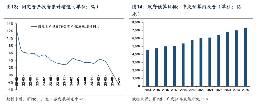 表明不局限于投资本身,而是更注重长期目标和结构优化。投资于物上,以2025年的5000亿元政策性金融工具为例,共支持2300多个项目,项目总投资约7万亿元,拉动倍数约14倍与2022年拉动倍数基本持平。政策性金融工具对基建和信贷拉动的影响具备长期性,受资金使用进度、配套融资落地情况影响,对社融的拉动偏长期性,2026年预计仍能看到其对基建投资的拉动作用。中央经济工作会议提出“推动投资止跌回稳,适当增加中央预算内投资规模”,数据上看,2025年1-11月固投累计增速为-2.6%,预计2026年有望止跌回稳,中央预算内投资近两年在7000亿元以上,增速约为5%,预计2026年为7700亿元。优化实施“两重”项目,优化地方政府专项债券用途管理,继续发挥新型政策性金融工具作用,预计2026年对两重、专项债用途进一步规模,政策性金融工具是主要抓手。
