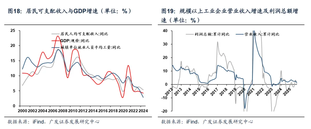 对于体感的问题,居民企业对于5%的经济增速的感受,取决于GDP增长多大程度留至居民/企业部门,这是影响消费的重要因素。从可支配收入上看,2023、2024年名义GDP增速分别为4.88%、4.23%,居民可支配收入增速分别为6.33%、5.34%,而城镇单位就业人员平均工资则仅为5.85%、2.83%。故当前看到的需求端的政策实施意义重大,一是提升效率和回报率,通过市场化的手段支持经济,二是解决我国杠杆问题。十五五规划和中央经济工作会议提出“指定实施城乡居民增收计划”,发改委文章《坚定实施扩大内需战略》中“提高居民收入在国民收入分配中的比重,提高劳动报酬在初次分配中的比重,努力实现居民收入和经济增长同步、劳动报酬提高和劳动生产率提高同步”。
