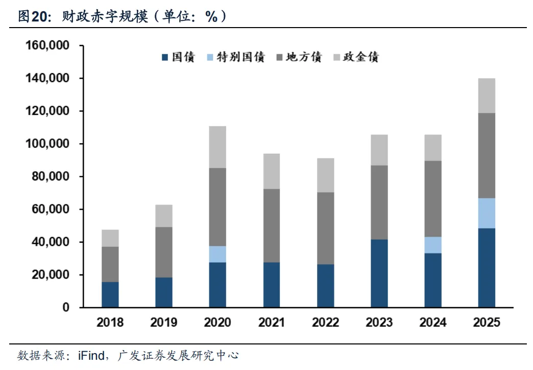 对于政府债券,预计2026年净发行规模为14.8万亿元。2025年中央政府赤字4.86万亿元、特别国债1.8万亿元,若按2025年初指定的5%的GDP增速与前三季度的GDP累计平减指数计算,2025年名义GDP为143.1万亿元,国债净融资额/名义GDP为4.65%,我们预计2026年财政政策积极有为,设定“国债净融资额/名义GDP=5%”,假设2026年GDP目标增速与通胀水平与今年相同,测算2026年国债净融资规模约为7.6万亿元。对于地方政府债,假设地方政府债净融资额与今年持平为7.2万亿元。