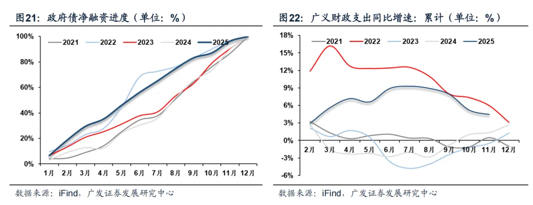 从节奏上看,2024年财政发力后置,主要受新增专项债发行后置从政府债与置换债在年末集中发行影响;2023年财政发力后置,国债/地方债发行均在三季度提速。历史上的财政后置有其客观原因,一季度信贷开门红拉动总量需求,二季度经济数据编辑走弱,7月政治局会议后发行提速带动财政后置。2025年财政明显靠前发力,上半年政府债净融资完成全年的52%,进度仅慢于2022年,2022年财政偏向于前置,主要受疫情影响预算安排加速执行;从广义财政支出上看,上半年累计增速8.9%,仅慢于2022年。