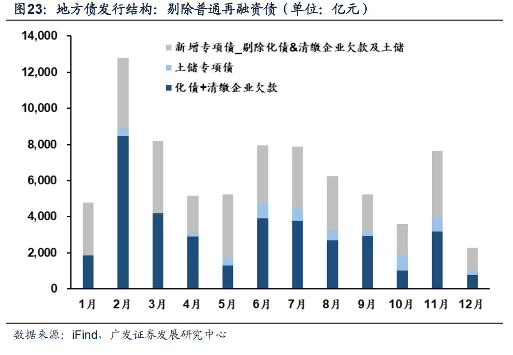 资金用途上看,用于非项目类占比提升,着力优化企业现金流量表。2025年两会工作报告中提出“拟安排地方政府专项债券4.4万亿元、比上年增加5000亿元,重点用于投资建设、土地收储和收购存量商品房、消化地方政府拖欠企业账款等”,提出专项债用于偿还实体企业拖欠款项,该政策对企业的现金流量表优化意义明显。2025年1.37万亿特殊新增专项债中,除8000亿元隐债置换外,还有5700亿元偿还欠款,土储专项债时隔5年后重启、已发行5759亿元。