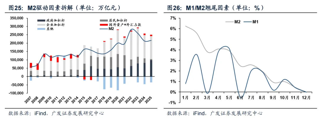 广义流动性上,我们预计上半年高基数影响下广义流动性偏宽松,企业/居民杠杆意愿修复,全年M2增速约为7.55%。M2增长的驱动因素上看,包括企业加杠杆(对非金融机构债权)、居民加杠杆(对其他居民部门债权)、政府加杠杆(对政府债权)、外汇派生与其他。政府和企业是M2增长的主要贡献来源,2015年起政府加杠杆对M2的贡献率由23.9%提升至2025年的45.5%,企业加杠杆2025年贡献M2增量的63.6%。我们预计2026年政府加杠杆仍是M2主要贡献来源,而居民和企业杠杆意愿编辑修复。基数效应上看,明年上半年M2高基数,全年M2增速约为7.55%。