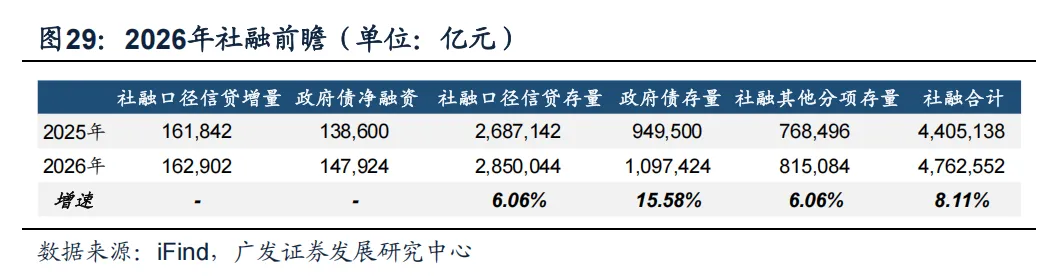对于政府债券净融资,我们在报告《从M2看2026年债市流动性》中测算,预计2026年净发行规模为14.8万亿元。2025年中央政府赤字4.86万亿元、特别国债1.8万亿元,若按2025年初指定的5%的GDP增速与前三季度的GDP累计平减指数计算,2025年名义GDP为143.1万亿元,国债净融资额/名义GDP为4.65%,我们预计2026年财政政策积极有为,设定“国债净融资额/名义GDP=5%”,假设2026年GDP目标增速与通胀水平与今年相同,测算2026年国债净融资规模约为7.6万亿元。对于地方政府债,假设地方政府债净融资额与今年持平为7.2万亿元。对于其他分项,在其他分项与人民币信贷比例与2025年10月持平的情况下,预计2026年全年社融增速为8.11%。
