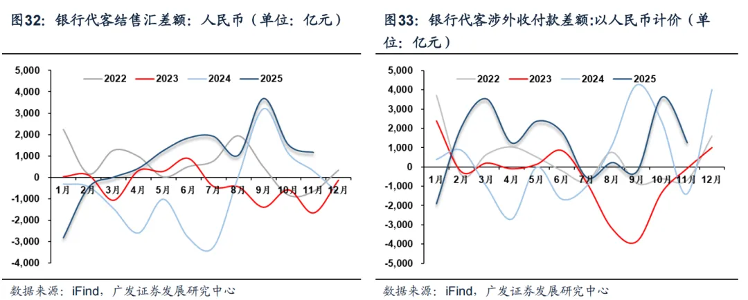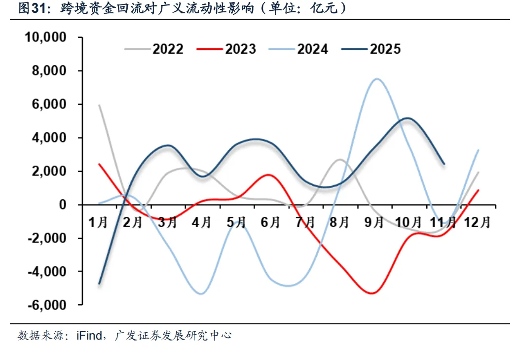 涉外资金回流存在三个步骤:企业涉外资金回款、涉外收付款与银行结售汇、银行与央行结售汇。其中第一步若涉外资金回款为外币,则对银行报表而言资产端增加外币资产、负债端增加外币存款,若为人民币则直接补充流动性,第二步银行负债端外币存款变为人民币存款,若不与央行结汇则银行间流动性反而收紧。仅观察数据,跨境资金流入从2024年8月开始持续,2-11月跨境资金净流入2.77万亿元。