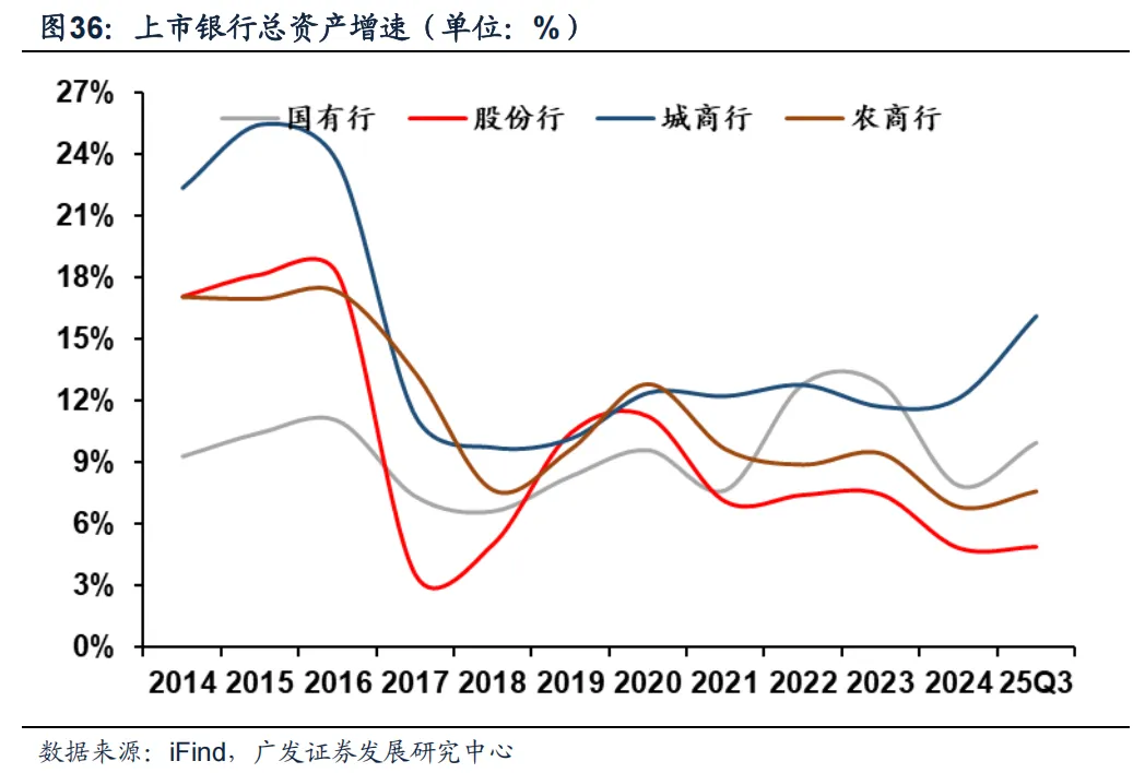 资产增速上,上市国有行、股份行、城商行、农商行25Q1-3资产增速分别为9.95%、4.89%、16.12%、7.56%,较2024年分别+2.1pct、0.1pct、4.0pct、0.76pct。国有行、城商行资产增速进一步提升,其原因在于资产端六大行增资落地、财政赤字率提高及化债政策下大行承接政府债规模较大,城商行受地方性投资影响资产增速也较高,其余银行可能资负两端同时疲弱。