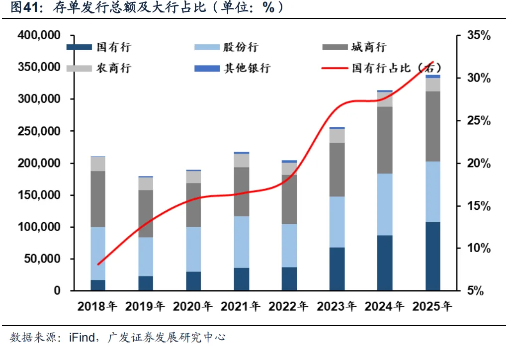 资产端,2021年起国有大行贷款占比提升,其余银行占比下降;负债端,存款基于比价优势向小行流动,股份行、农商行存款占比提升,资金流向为大行→中小行(非银)→存单(非银存款)→大行,故2022-2024年流动性逻辑为“大行放贷、小行买债”,大行存单发行规模明显提升,2025年大行存单发行占银行业比重为31.9%。