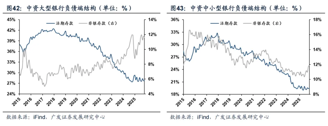 负债结构的另一个变化是存款的非银化。2024年4月打击手工补息与11月的非银存款自律机制对高息存款进行规整,2025年以来存款非银化趋势持续,非银存款带动银行成本率偏刚性。