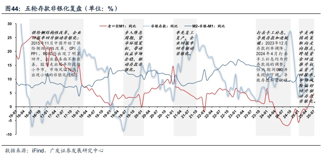 第五轮(2025年1月-2025年7月):中美两国政策取向走向拐点,跨境资金回流推升权益资产回报率,市场风险偏好回升驱动存款非银化。国内而言,2024年7月政治局会议指出“宏观政策要持续用力、更加给力”。2024年10月18日潘行长在论坛讲话中总结了未来政策思路的4个重要变化:(1)目标体系将把物价合理回升作为重要考量;(2)宏观经济政策的作用方向从过去更多偏向投资,转向消费与投资并重并更加重视消费;(3)更好处理政府与市场的关系,科学把握和平衡政府与市场的边界,提高政策与市场关切的交集度和针对性;(4)进一步深化改革开放,营造良好的法治经济环境。