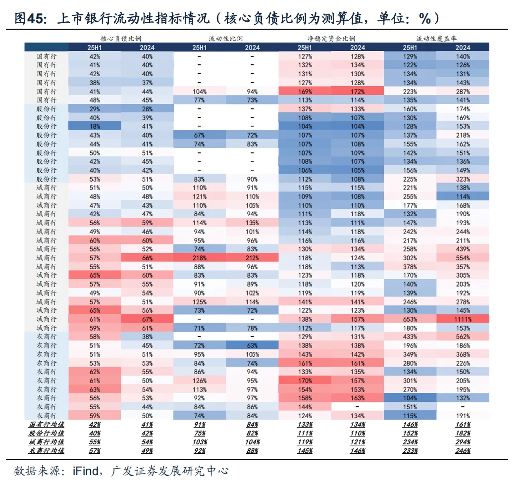 存款非银化使得部分银行流动性指标承压,银行的季末调指标行为更为明显。目前银行的流动性监管指标包括流动性匹配率(LMR)、流动性比例(LR)、净稳定资金比例(NSFR)、流动性覆盖率(LCR)、优质流动性资产充足率(HQLAAR)、核心负债比例。对比2024年与25H1数据,股份行在流动性指标上承压更为明显,考虑到银行季末的指标考核,预计季末银行对普通存款(特别是定期存款)、长期限存款的诉求提升。