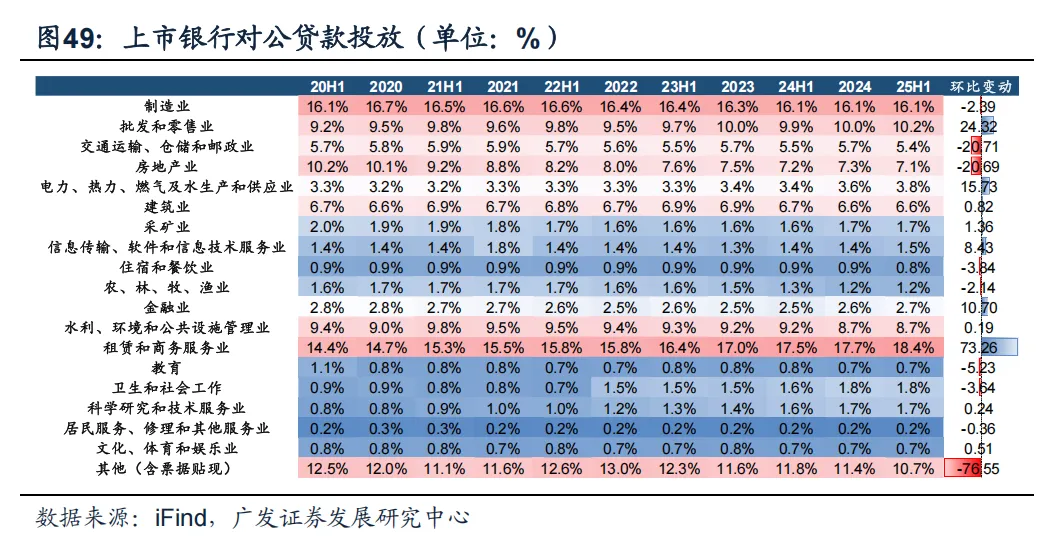 分行业来看,25H1上市银行对公贷款投放中租赁和商务服务业、批发零售业、电力热力行业占比提升,交通运输、房地产业占比下降。