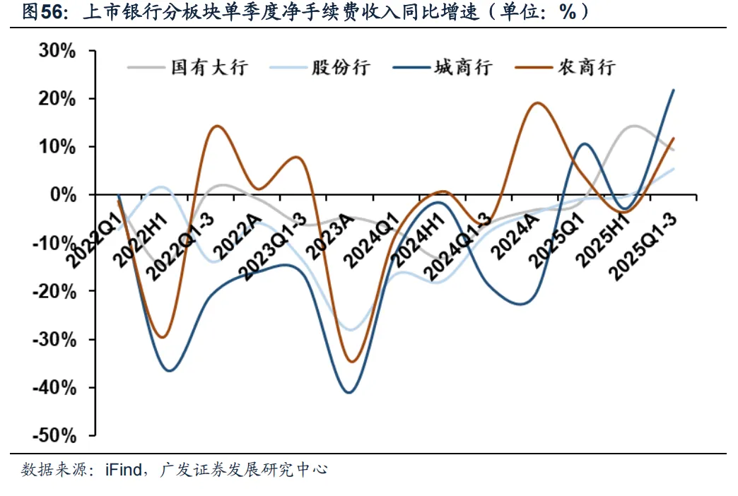 2025年银行中收增速转正,国有行、股份行、城商行、农商行前三季度累计净手续费收入增速分别为5.93%、1.3%、8.85%、3.9%,上市银行中收占营业收入的比例达14%,根据中报显示,主要中收贡献为托管业务、理财业务和代理业务,一方面是考虑到2024年受降费政策等影响,形成明显低基数;二是经济偏弱,消费回落,信用卡风险暴露增加,银行卡相关业务收入回落。展望2026年,预计随着资本市场活跃度提升、银行结汇交易量加大,26年净手续费增长有望回正,其中代理业务、支付结算业务见长的银行将更为受益。