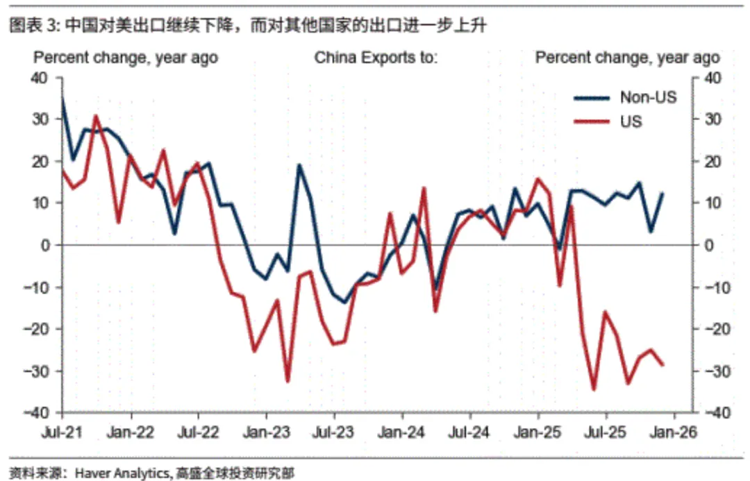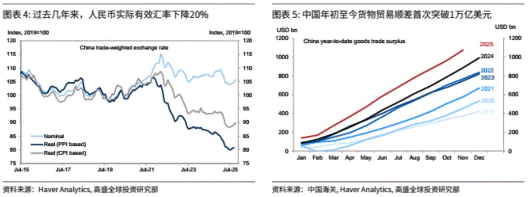 第二个分化是出口内部的结构差异。图表数据显示,今年对非美国家的出口表现强劲,始终维持在零轴以上的正增长区间;而代表对美出口的红色线条,虽在日内瓦谈判与元首会面后趋于稳定,税率相较于特朗普第二次执政前有所提升,但整体表现弱于对非美国家的出口。关于市场关心的“转口贸易”疑问,高盛判断,明年对非美国家的出口仍将保持强韧性,核心原因在于今年对新兴市场的出口增长,并非依赖“经新兴国家转口至美国”的模式,而是源于新兴经济体自身强劲的内需。若这一态势持续,明年出口仍将维持较强活力。