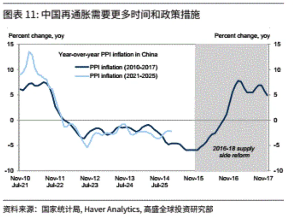 针对通胀与反内卷政策的分析中,高盛认为当前需求端刺激仍显不足。这里的需求端刺激不仅指政策发力,更包括内生需求的恢复。回顾2015年供给侧改革1.0,当时推动再通胀的核心因素有两个:一是出口的显著走强,二是房地产棚改去库存带来的产业链拉动效应——买房后带动家电消费、装修等下游需求,成为内需提振的关键。而当前不仅内需提振难度较大,且政策覆盖更多是下游民营企业,行政主导的反内卷推进难度更高。因此,外资投行的一致判断是,此次反内卷政策将呈现“渐进式”与“分行业差异化”特征,不同行业、不同部门的再通胀前景存在明显差异。