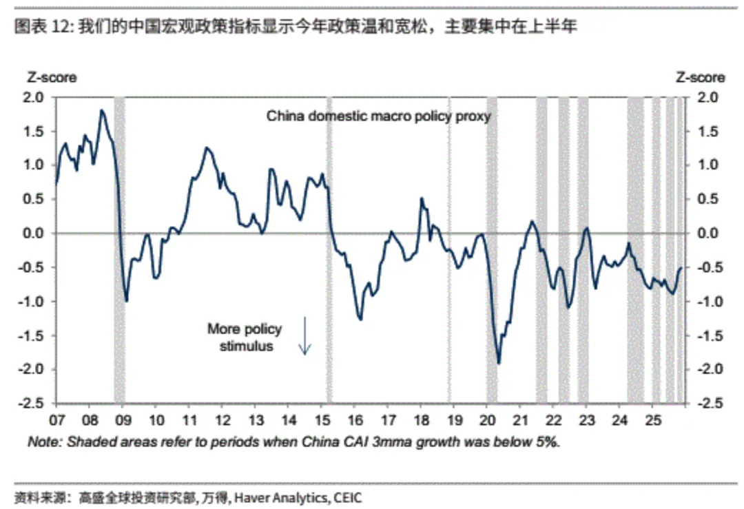 高盛与其他外资投行在政策方面的观点一致:我国政策以“反应式”为主,而非前置性调控。即经济下行时出台政策对冲,经济向好时政策则适度退坡。这一判断可通过政策力度监测图表佐证:图表中蓝色线条越靠下,政策力度越强;越靠上,政策力度越弱。今年下半年,蓝色线条明显上移,政策出现退坡,核心原因在于出口表现强劲,全年5%左右的GDP增速目标有望达成。因此,在高盛看来,决策层更倾向于将部分宽松空间留到明年——尤其是明年作为十五规划的“开门红之年”,将政策储备到明年用于对冲经济下行,比年底集中释放更具价值。