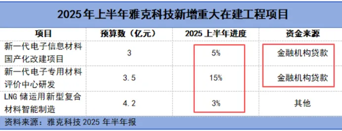 截至2025年上半年,雅克科技在建工程13.26亿元,并集中于光刻胶配套试剂、半导体用电子粉体材料、电子专用材料研发等产线。