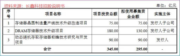 根据招股说明书,长鑫科技295亿元募资额主要流向存储器晶圆产线技改(75亿元)、DRAM存储器技术升级(130亿元)以及动态随机存取存储器开发(90亿元)。