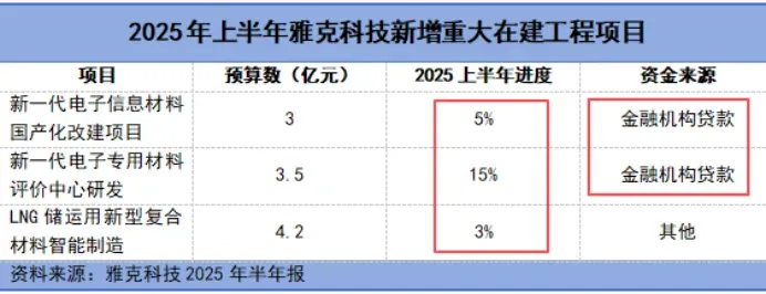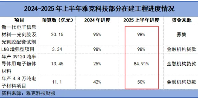 截至2025年上半年,雅克科技在建工程13.26亿元,并集中于光刻胶配套试剂、半导体用电子粉体材料、电子专用材料研发等产线。