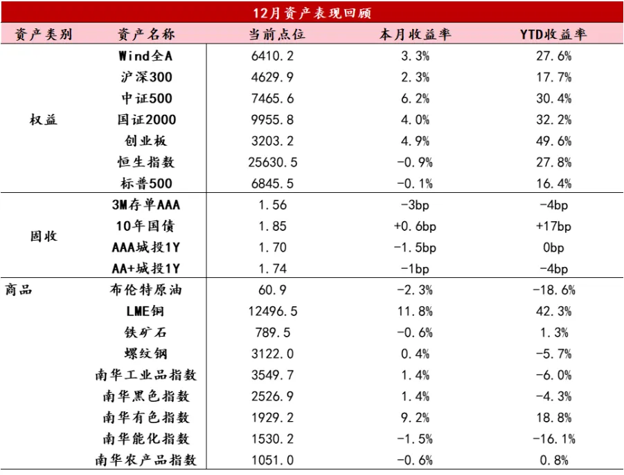 12月,美联储降息如期落地、后续降息预期有所波动,美股科技巨头内部分化,纳斯达克指数震荡;国内方面,上旬市场缺乏短期催化因素、年末效应下流动性趋紧,A股整体震荡运行,下旬中央经济工作会议定调积极、美元指数下行带动人民币加速升值,跨年行情开启,上证指数走出11连阳。全月来看,万得全A录得+3.3%。市场呈现反杠铃风格,万得微盘股指数-2.8%,中证红利指数-0.75%;中小盘成长表现居前,中证500指数+6.17%,中证1000指数+3.56%。行业上,60%的申万一级行业上涨,商业航天催化不断,带动国防军工(+17.22%)表现强势,美元指数下行、贵金属走强,有色金属(+13.68%)涨幅居前,AI投资叙事延续,通信(+12.06%)表现紧随其后。港股市场整体表现依然不佳。恒生指数全月-0.9%,恒生科技-1.5%,市场成交活跃度持续降低(月日均成交环比-17.6%)。南下资金单月净流入229亿港元,创近两年来最低单月净流入规模。