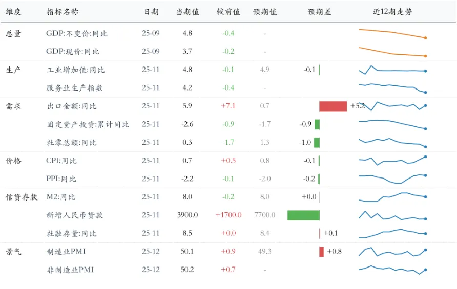 从增长-通胀来看,当前新旧动能分化明显,高技术制造业与出口的亮眼表现展示了经济转型的正在进行式,但传统地产与消费的疲弱也暴露了转型的痛点。2025年11月以来,高基数效应叠加内需不足,使得经济增速放缓的幅度超出市场预期。尽管12月PMI数据已通过生产与需求的改善释放出反弹信号,但11月经济数据的深度调整也再度提示当前经济复苏的基础尚不牢固,微观主体对未来的整体信心仍有待修复,温和再通胀的实现仍然需要时间。