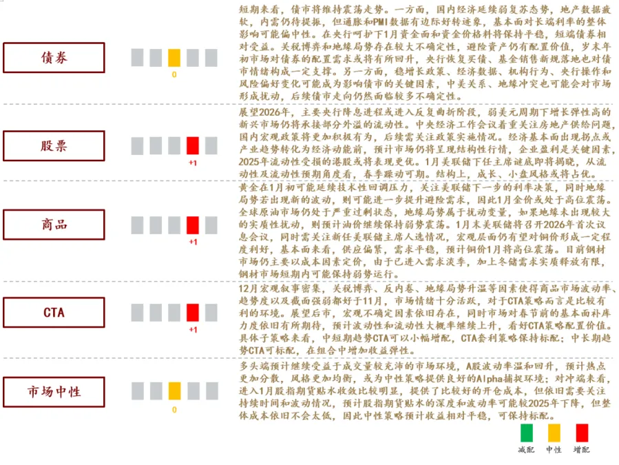 展望2026年,主要央行降息进程或进入反复曲折阶段,弱美元周期下增长弹性高的新兴市场仍将承接部分外溢的流动性。中央经济工作会议着重关注房地产供给问题,国内宏观政策将更加积极有为,后续需关注政策实施情况。经济基本面出现拐点或产业趋势转化为经济动能前,预计市场仍将呈现结构性行情,企业盈利是关键因素,2025年流动性受损的港股或将表现更优。结构上:周期反转或从有色向化工等行业扩散,内需相关的泛消费板块进入左侧布局区间;科技成长和外需出海从主线行情进入分化阶段,需寻找业绩兑现度高或景气可持续的细分方向;低利率和资产荒背景下,高股息防御性资产仍是长线资金重要的配置盘。短期来看,美联储下任主席谜底即将揭晓,春节前结汇有望推动人民币的稳定与升值,流动性及流动性预期角度看,春季躁动可期。结构上,成长风格、小盘风格或将占优。