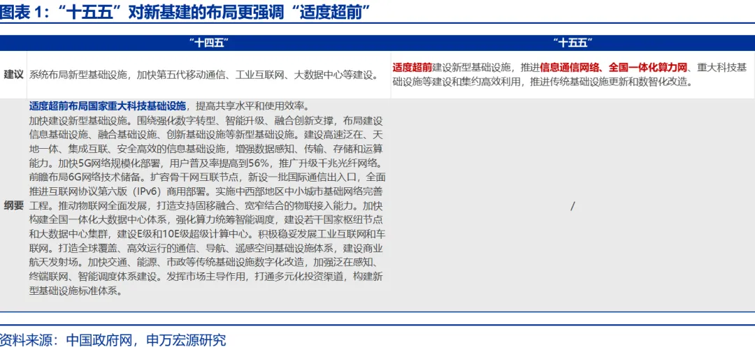 “十五五”建议明确“适度超前建设”要求,重点推进信息通信网、算力网等建设及传统基建数智化改造,进一步强化新基建定位。“十四五”规划和2035年远景目标建议曾提出“系统布局新型基础设施,加快第五代移动通信、工业互联网、大数据中心等建设”;与之相比,“十五五”建议进一步强化新基建定位,明确“适度超前建设新型基础设施,推进信息通信网络、全国一体化算力网、重大科技基础设施等建设和集约高效利用,推进传统基础设施更新和数智化改造”。新基建覆盖范围显著拓宽,全面涵盖通信网络、数据与算力建设各领域。