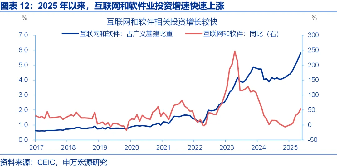 1)“十五五”建议明确的适度超前新基建覆盖范围显著拓宽,涵盖通信网络、数据算力等领域,内涵随经济数字化转型持续拓展,已从单一技术方向转向系统布局并强化公共服务属性。新基建成为广义基建投资核心,2019年至2025年11月,电力热力、互联网软件等相关投资占比提升,传统“铁公基”占比则明显下降。