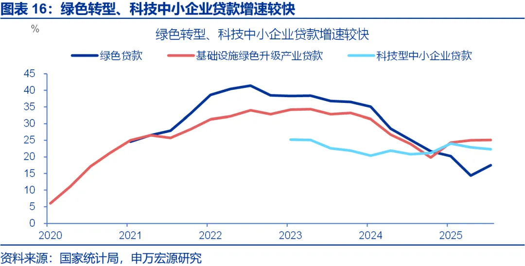 货币政策方面,央行前期推出的科技创新和技术改造再贷款等工具已精准支持新基建相关领域,后续或进一步扩容或新增细分领域结构性工具,推动货币与财政政策协同发力。2024年7月,央行创设科技创新和技术改造再贷款,2025年5月将其额度扩大至8000亿元,重点支持初创期、成长期科技型中小企业。该工具虽未直接指向新基建,但为其快速发展提供了有力支撑。此外,碳减排工具等助力绿色转型的结构性货币政策工具,也将持续赋能新基建。截至2025年三季度,绿色贷款、基础设施绿色升级产业贷款、科技型中小企业贷款增速分别达17.5%、25.1%和22.3%。