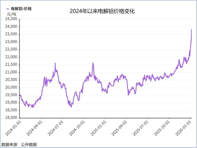 2024年1月,我国电解铝价格在19000元/吨左右徘徊,2026年1月初,这一价格已接近24000元/吨。