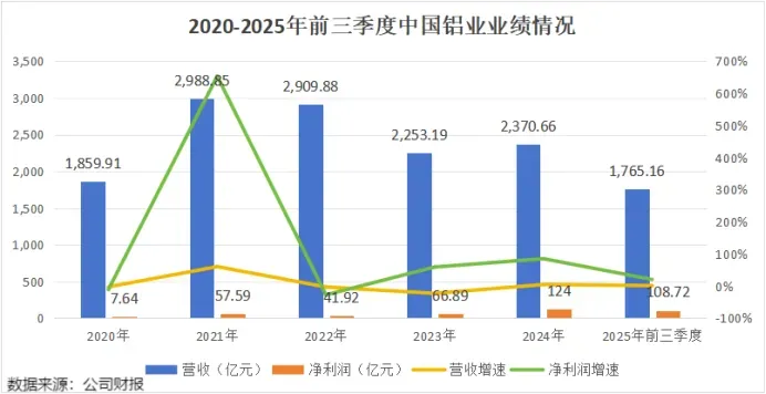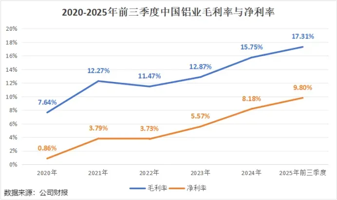 2020-2025年前三季度,中国铝业的毛利率由8.24%大幅提升至17.31%,净利率也从0.85%增至9.8%。