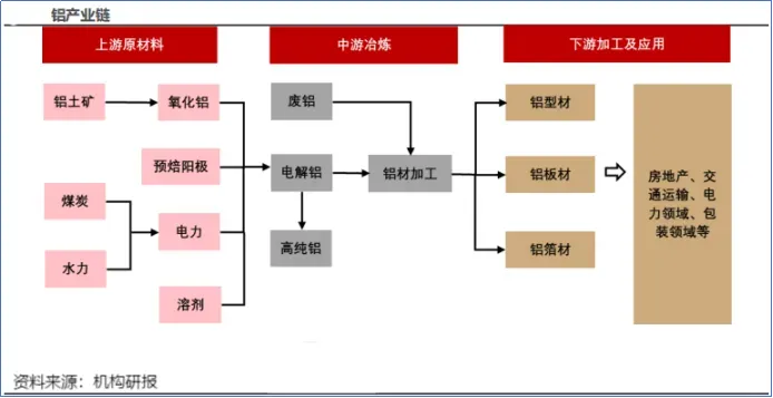 在下游加工端,铝锭、铝基合金等产品被输送到房地产、交通运输、电力、包装等行业。
