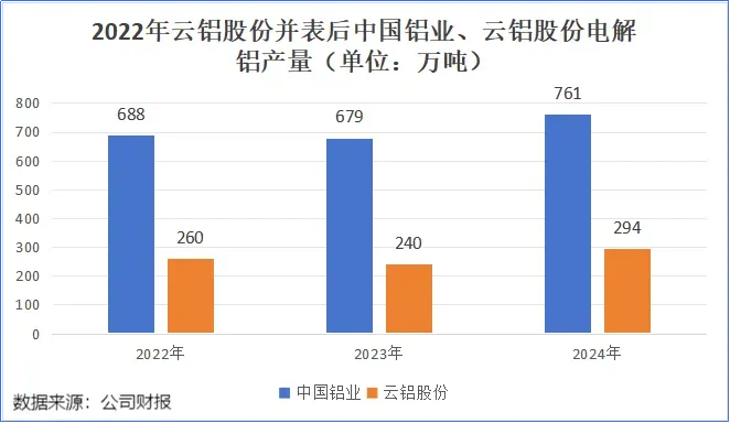2024年,云铝股份电解铝产量达到294万吨,为中国铝业贡献了接近40%的产量。