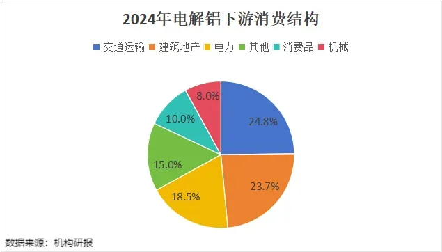 电解铝需求的前三大行业分别为交通运输、房地产、电力。其中,交通运输对铝材的需求量占比达24.8%,建筑地产占比23.7%,电力领域占比18.5%。