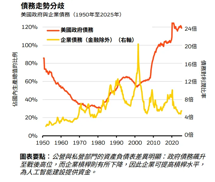 公共部门(政府):债务已达战后高位,难以在 AI 长期建设中承担更多融资责任; 私人部门(企业):杠杆率从历史高峰显著回落,具备加杠杆(借债)的空间—— 这正是大型科技企业可通过发债等方式,为 AI 建设筹措长期资金的核心支撑。
