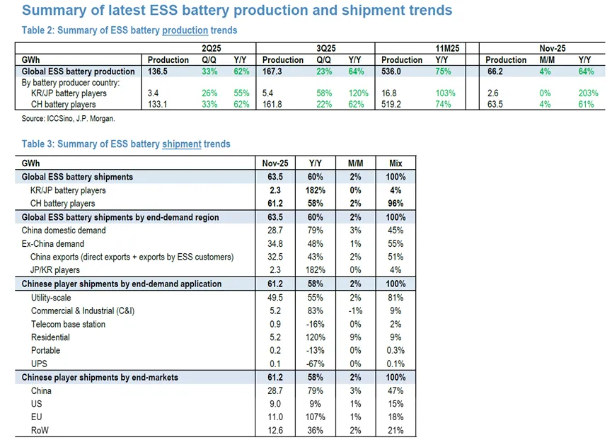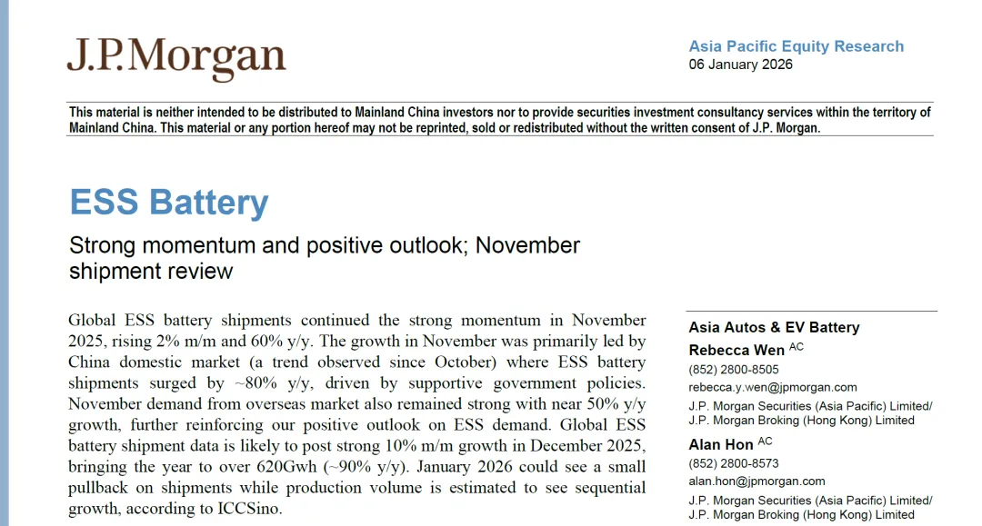 本文基于JPM 2026年1月6日发布的研报《ESS Battery Strong momentum and positive outlook; November shipment review》整理。