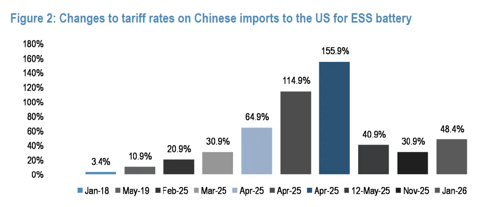 美国市场在2025年呈现出鲜明的两面性。一方面,BESS装机量在前11个月达到13.1GWh,同比增长45%,显示出强劲的市场需求;另一方面,关税政策的持续升级给中国供应商带来了巨大压力。