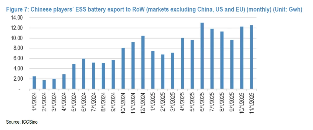 如果说美欧是储能市场的传统重镇,那么中东、东南亚、非洲和南美等新兴市场则是2025年最大的惊喜。这些区域在前11个月实现了110%的同比增长,出货量达到111.6GWh,占中国厂商海外出货量的比重提升至21%。