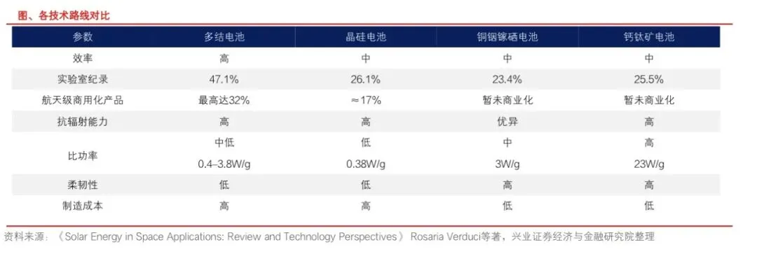 太空光伏技术路线迭代清晰,从成熟到新兴形成梯度布局:
