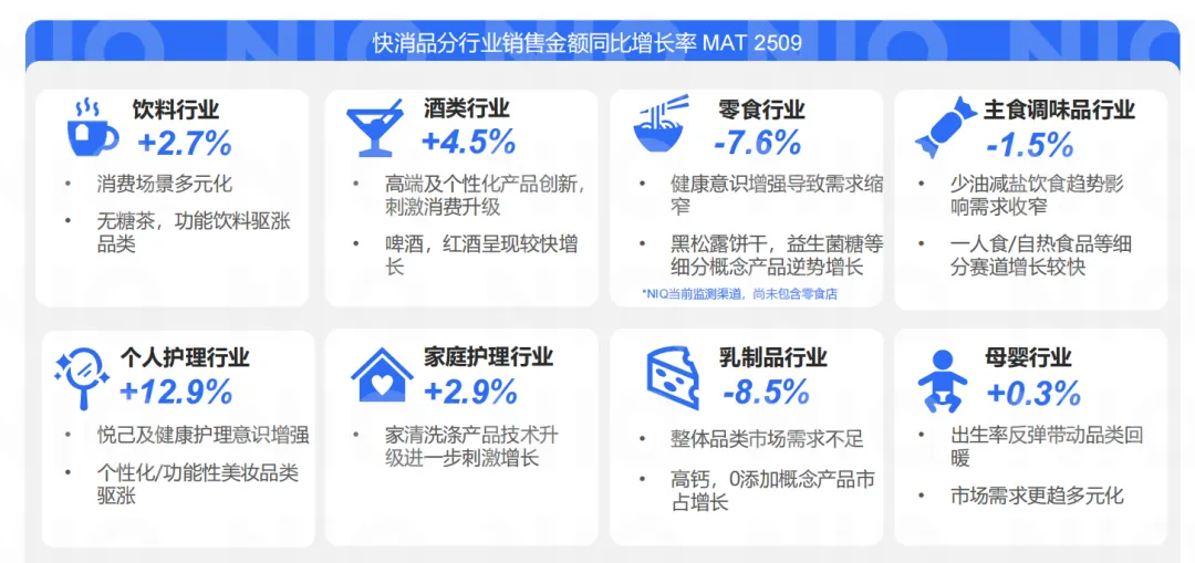 一方面,市场增速分化明显,渠道格局加速重构。快消品全渠道增速仅3.4%,其中线上渠道同比增长18.5%,线下渠道则同比下滑5.0%;细分渠道中,会员仓储店增速4%,零食店增速20%,O2O前置仓增速高达25%,新兴渠道已成为行业增长的核心引擎。